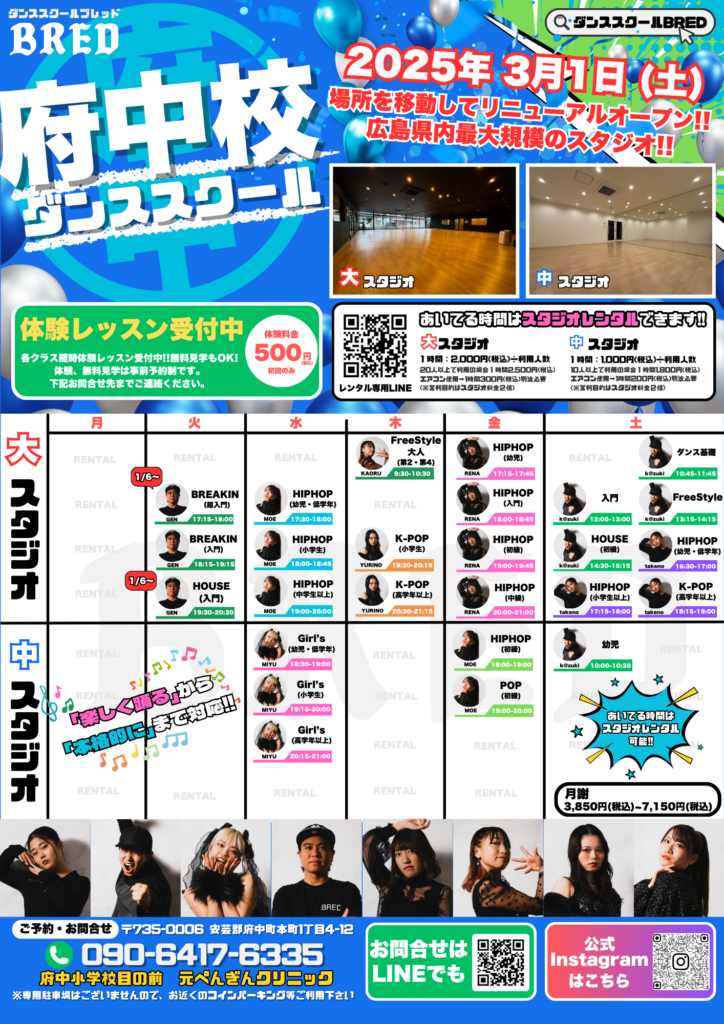 BRED 府中校 Lesson Scheduleレッスンスケジュール 月曜日火曜日水曜日木曜日金曜日土曜日 ACCESS 住所:〒735-0006 広島県安芸郡府中町本町1丁目4−12 府中埃宮(バス停) から徒歩3分 本町4丁目(バス停)から徒歩7分 イオンモール広島府中から徒歩20分/車で6分 専用駐車場はございませんので、お近くのコインパーキング等ご利用下さい CONTACT 見学・体験会のお問い合わせはこちらから