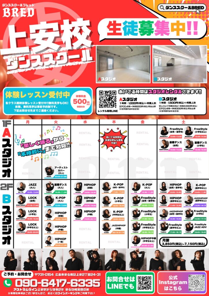 BRED 上安校 Lesson Scheduleレッスンスケジュール 月曜日火曜日水曜日木曜日金曜日土曜日 ACCESS 住所:広島市安佐南区上安2丁目24-31 アストラムライン上安駅から徒歩2分 安幼稚園目の前 フレスタ安店から徒歩2分 専用駐車場はございませんので、お近くのコインパーキング等ご利用下さい 外観 CONTACT 見学・体験会のお問い合わせはこちらから