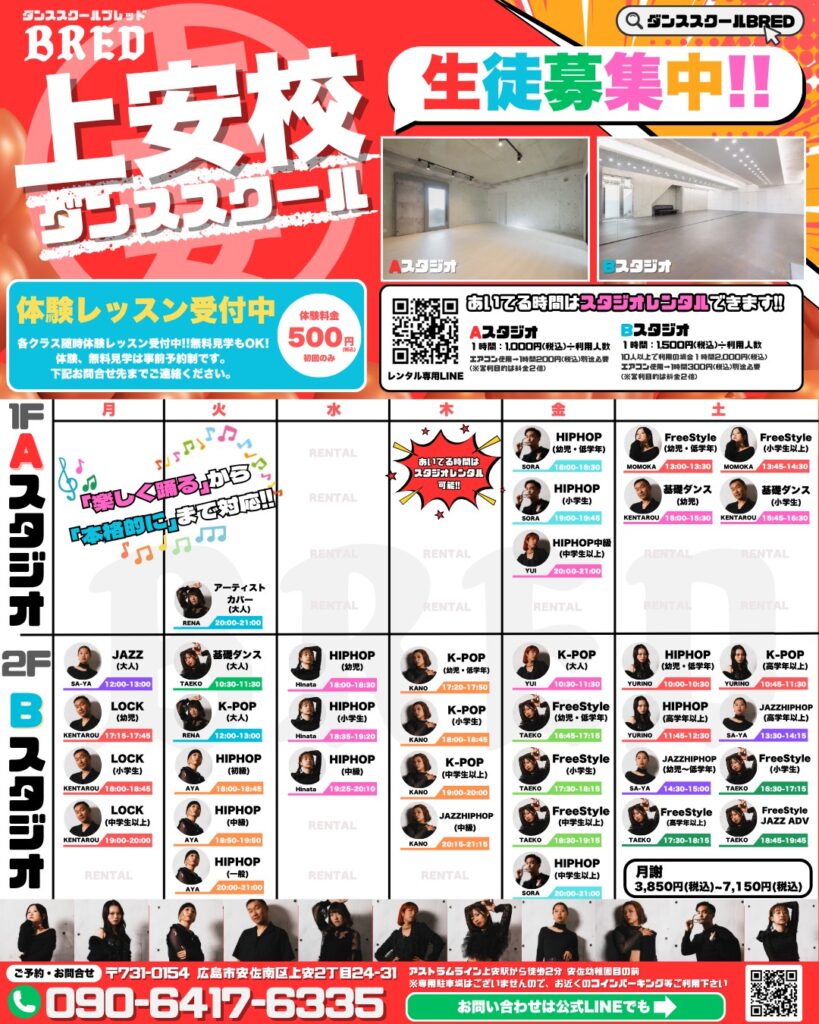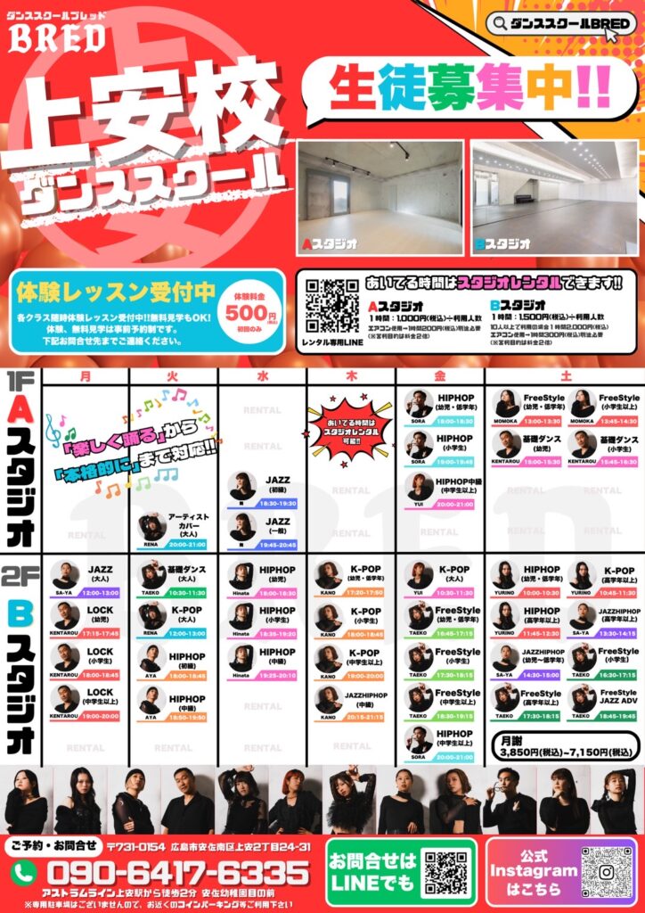 BRED 上安校 Lesson Scheduleレッスンスケジュール 月曜日火曜日水曜日木曜日金曜日土曜日 ACCESS 住所:広島市安佐南区上安2丁目24-31 アストラムライン上安駅から徒歩2分 安幼稚園目の前 フレスタ安店から徒歩2分 専用駐車場はございませんので、お近くのコインパーキング等ご利用下さい 外観 CONTACT 見学・体験会のお問い合わせはこちらから